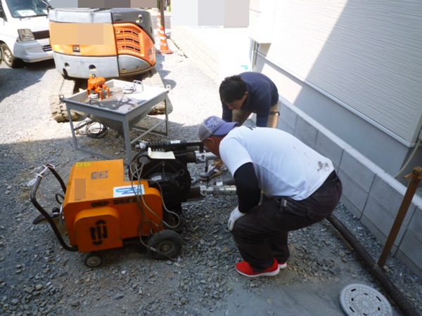 住宅地で建物が迫って建っている現場では、普段使っている大きなポンプ車でコンクリートを裏庭まで送り込むことは無理。