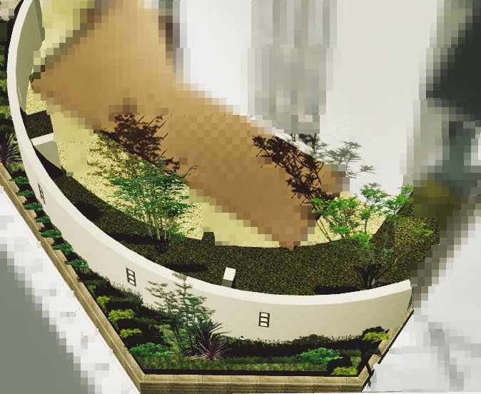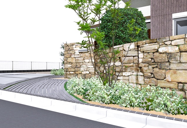 ⇊木津川市でご提案した、外周を大きなRの石積みで囲うプラン。
