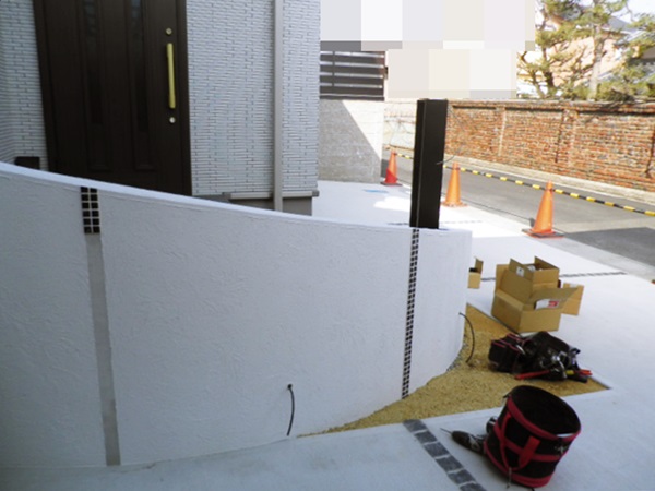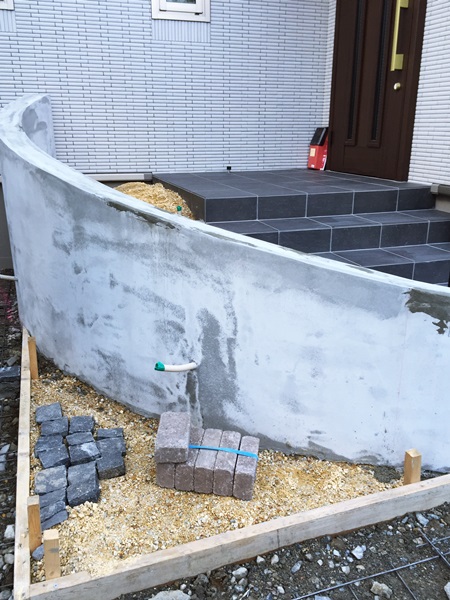 大津市、曲線門柱の外構【施工中の様子】