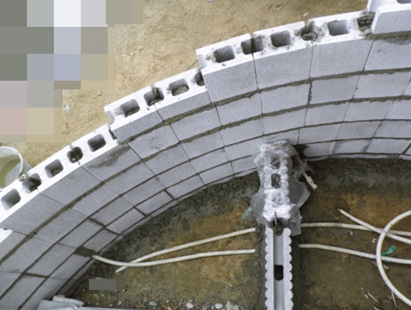 曲線の門柱を作るために、下地になるブロックを細かくカットして積んでいます。