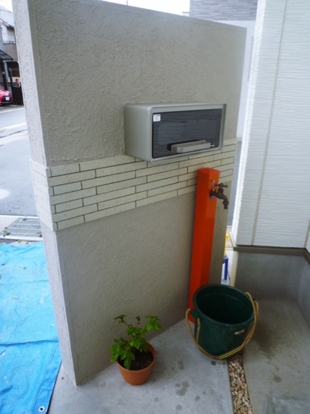 ↑まだ工事途中の写真ですが、門柱の裏のスペースを使って、アクセント色の立水栓を取り付けています。