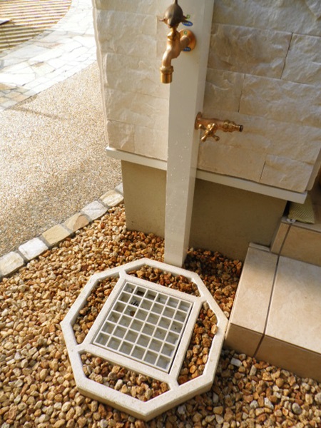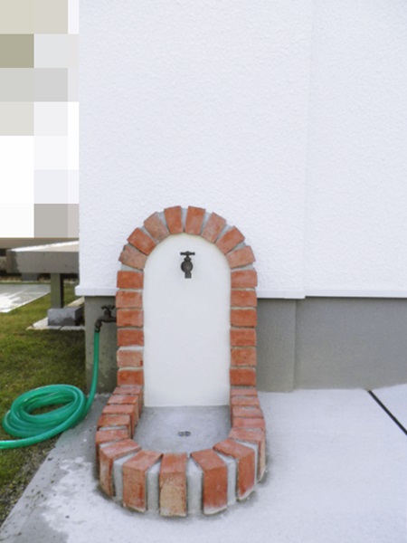 他にも、外構のイメージに合わせてこんなふうに現場で立水栓も立栓パンも作ってしまうパターンもあります↓