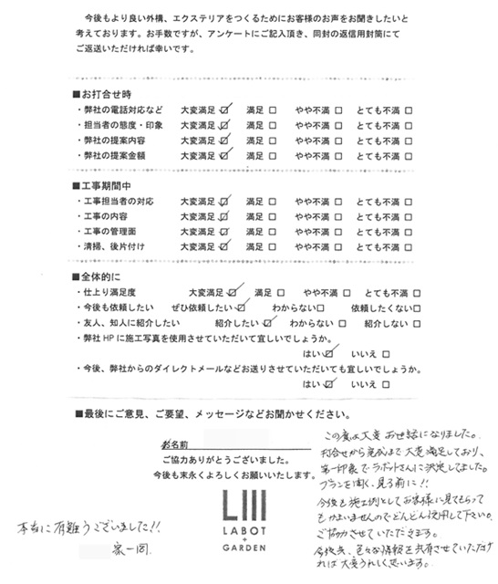 先日、新築外構工事のお引渡しが終わったお客様にお渡ししていたアンケート。