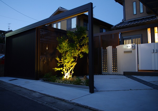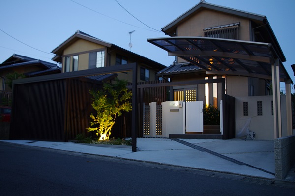 夜のライティング。閑静な住宅街なので、あまり派手になりすぎないよう、透かしブロックから漏れる灯りなどで外構を飾るようにしました。