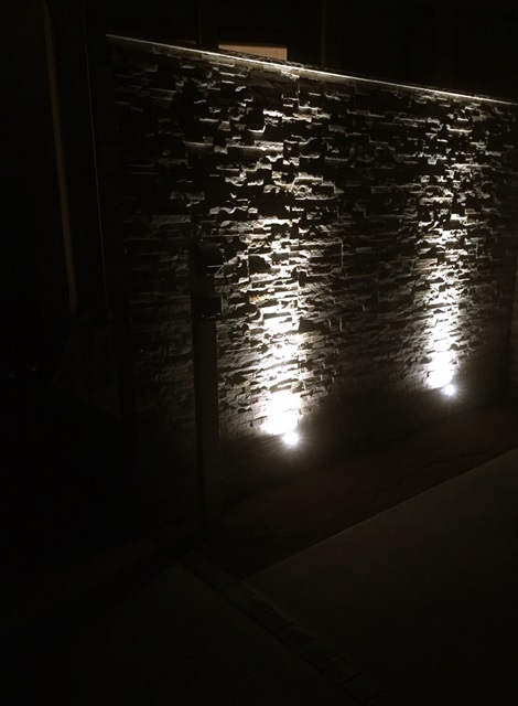 石の壁の凹凸がライトアップされるよう、下の方に小さなアップライトを仕込んでいます。
