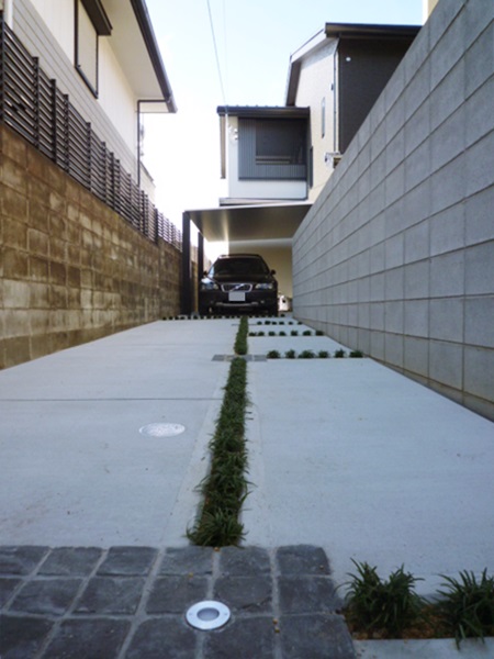 LIXILのカーポートSCに向かって伸びる緑の直線。 土間だけのガレージとは違ってカッコよくなりました♪