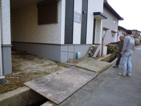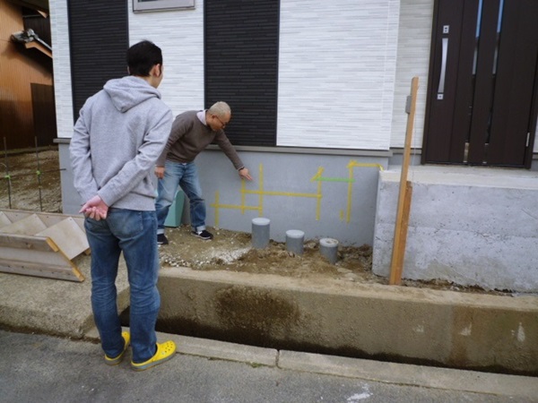 外構工事前に現場でN様にお立ち会いをしてもらってこんな感じになりますね~って一緒に確認。