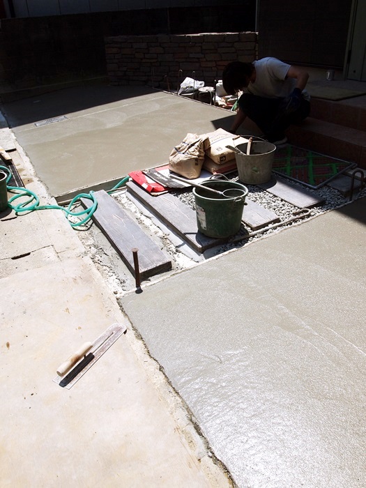 この暑さでどんどんコンクリートが乾いちゃうから、手早く仕上げないとね。