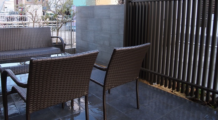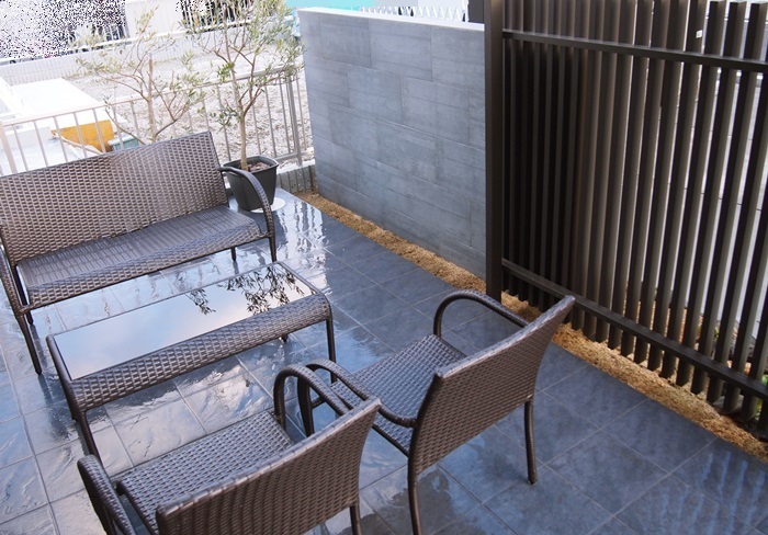 このタイルテラスの出幅は2M40cm。 テーブルと椅子を置いてもまだ余裕があります。