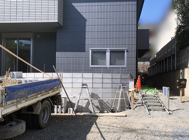 設計GLまで(写真で目地が白くなっている部分)はCP型枠ブロックでしっかり土留め。