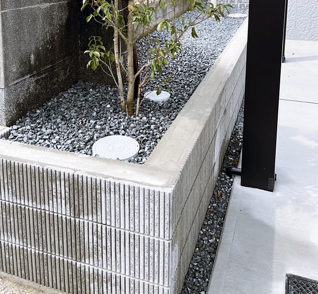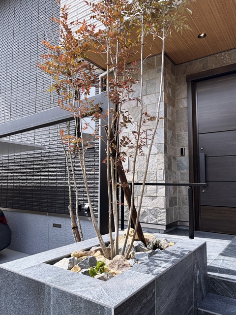 シンボルツリーのシマトネリコを植えて足元には栗石を入れてカッコよく仕上げ。