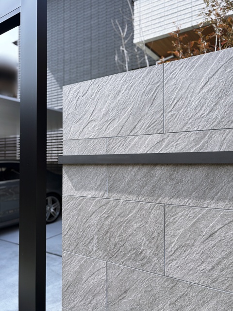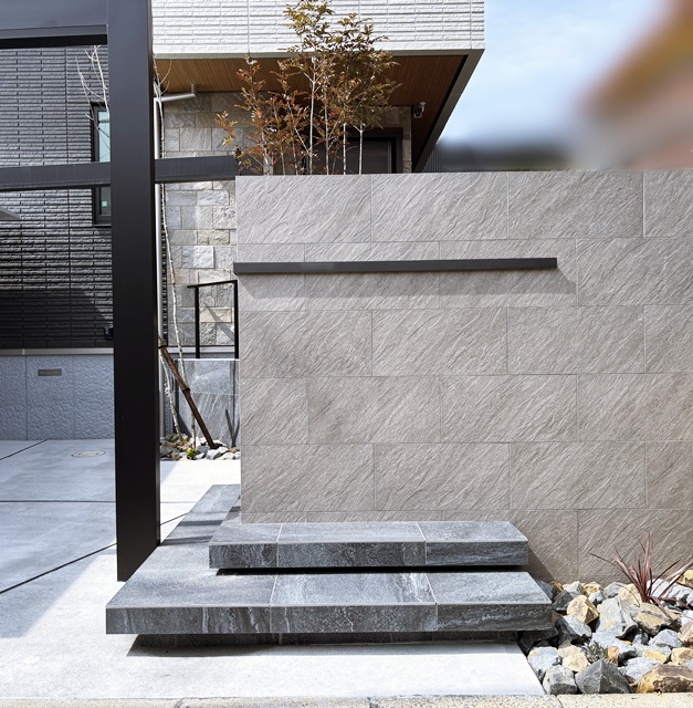 その横に浮き階段とタイル貼りの門柱を配置したオシャレな門回りを作りました。