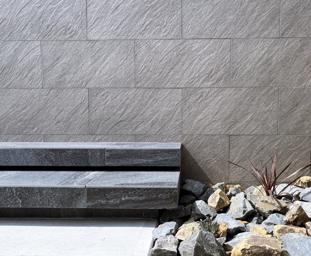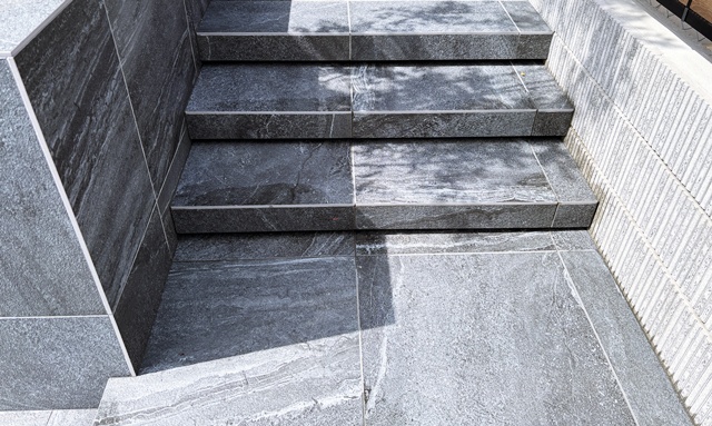 階段は60cm角の大判タイルで蹴込みを作ったフロー階段。