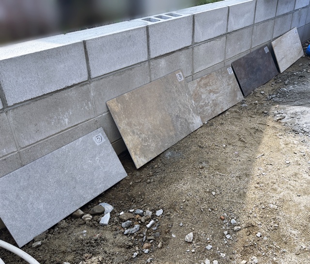 まずは昨日までに門柱のブロックが積み終わったので、用意したタイルのサンプルを見ながらM様と色の相談。