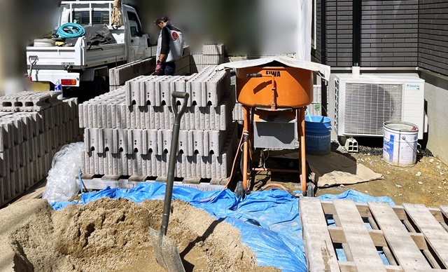 化粧ブロックとか砂とかセメントとか、材料どっさり現場に搬入したら早速組積工事スタート!