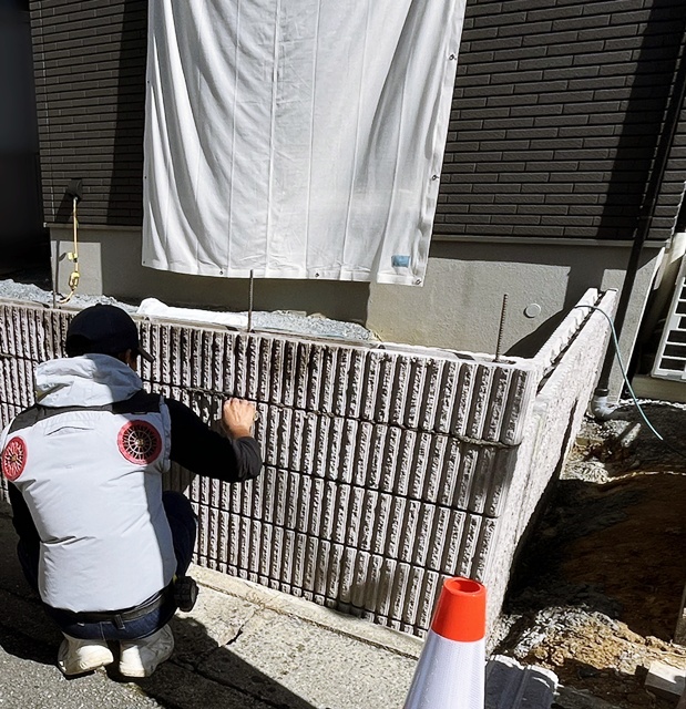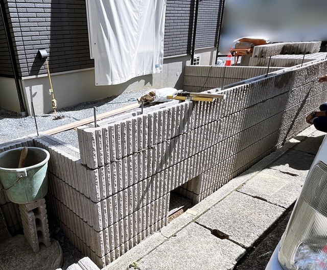 前回のblogからの続きの工程、お庭を囲う部分や門柱の下地になるブロックを積む工事を進めています。