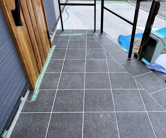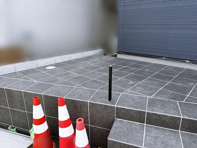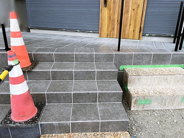 あれからタイル工事に着手をして階段と共に30cm角のタイル貼り仕上げで完成しましたー