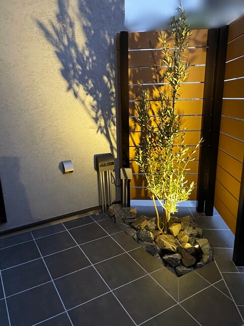 植栽をライトアップして壁にその葉影が映るように、枝ぶりがキレイなアオダモを入れました。